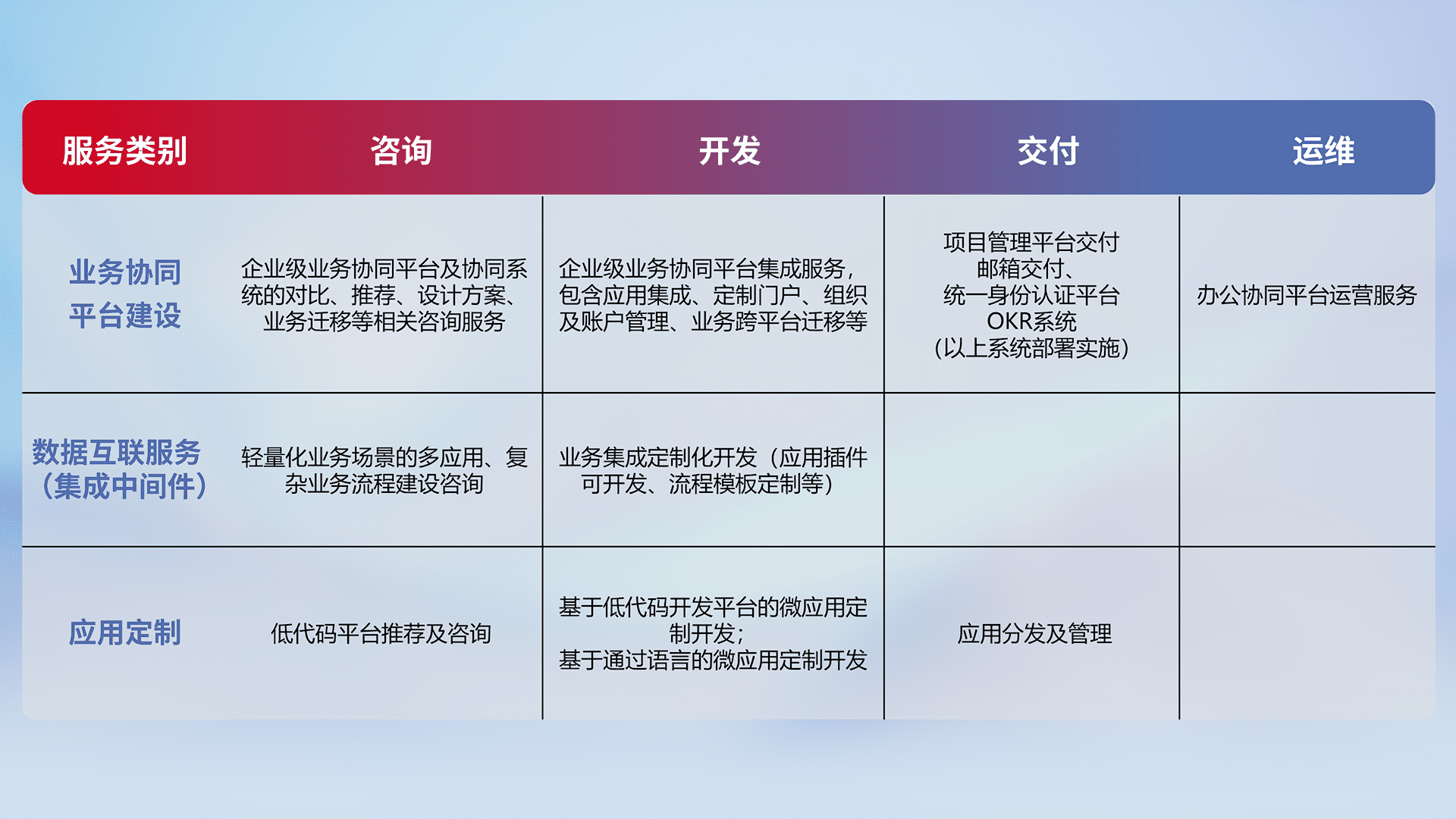针对钉钉、、企微、、、IDaas等平台级产品提供产品的规划、、、、方案、、交付、、、定制化开发等服务,,实现如统一协同办公、、、智能客户服务、、混合会议管理、、、、智能数据查询、、等业务场景,,,实现数字化转型。。。